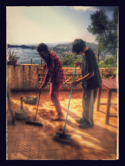 La fanciulla ci appare piu’ legata alla terra ,con i colori caldi della vesticciuola e i pantaloni;i suoi piedini non posano completamente sul suolo ed ella sembra danzare leggera ed aerea intorno al suo instrumento di pulitura.
